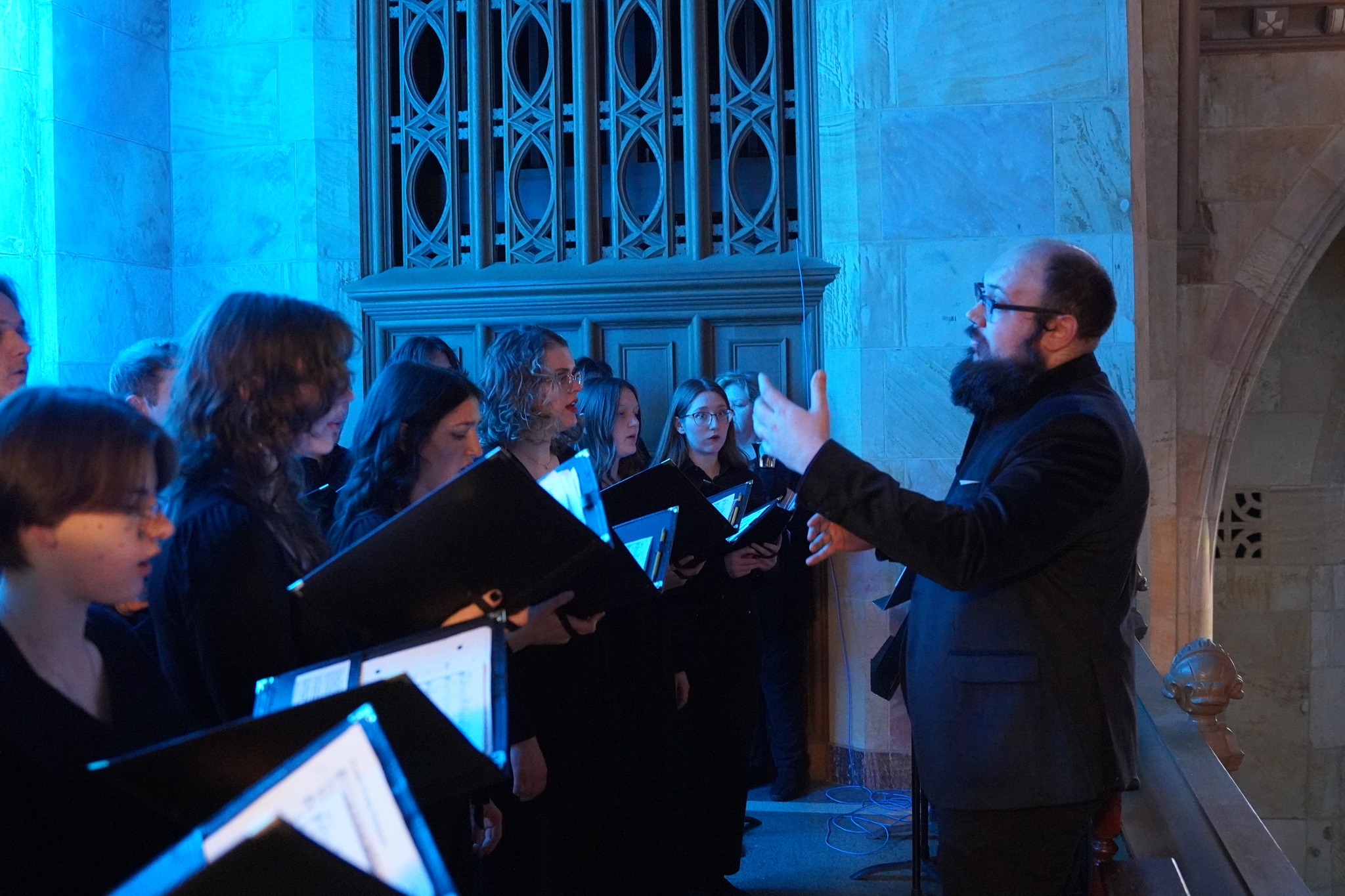 Dr. Thress leading the Vespers Choir in the Bishop Marty Chapel, December 2023